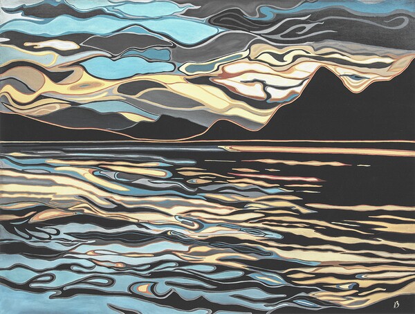 A modern depiction of a view from the water towards the west side of the lake in late afternoon light.